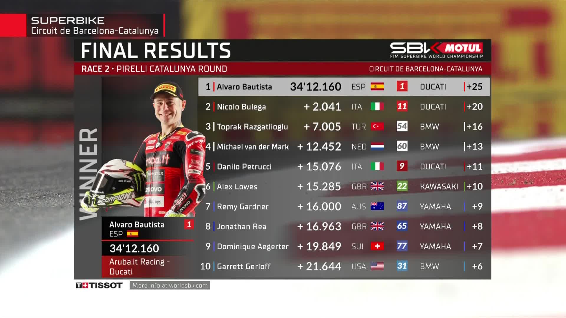 Après cinq courses passionnantes, entre Phillip Island et la Catalogne, le Superbike revient soudainement à la normale. Alvaro Bautista est de retour pour faire payer tout le monde, malgré les cinq kilos de lest, l’adhérence des pneus et tout le reste. Il s’agit de la 60e victoire du pilote madrilène, la septième ici à Montmelò lors des neuf dernières courses.