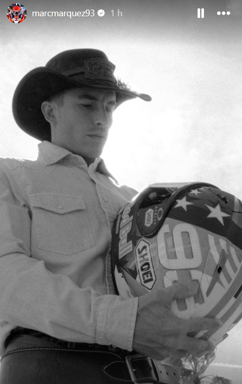 - Avant de piloter une MotoGP, Marc Marquez a testé son nouveau casque à cheval, tel un vrai cow-boy.