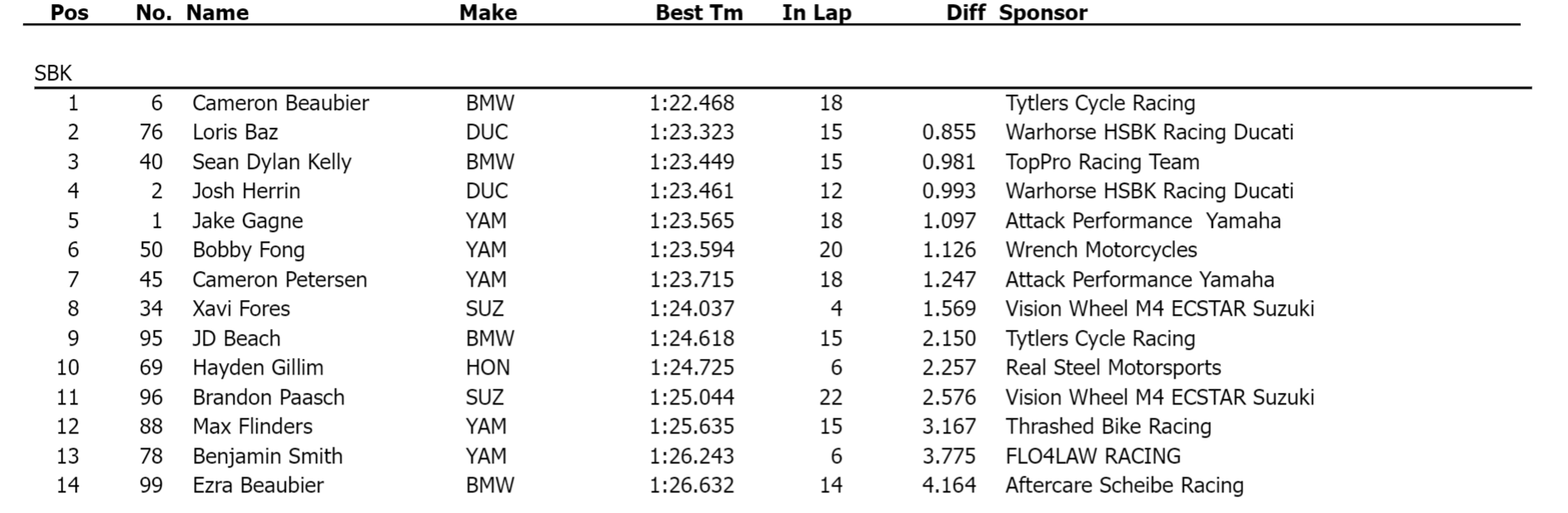 Moins de trois semaines après s’être cassé la cheville à Road Atlanta, le Français Loris Baz a terminé avec une excellente deuxième place en 1:23.323. Le pilote Ducati pointait toutefois à huit dixièmes de la tête avec la machine du team Warhorse HSBK Racing. Son coéquipier, Josh Herrin, devant lui en essais, a terminé quatrième de la séance avec un temps de 1:23.461.