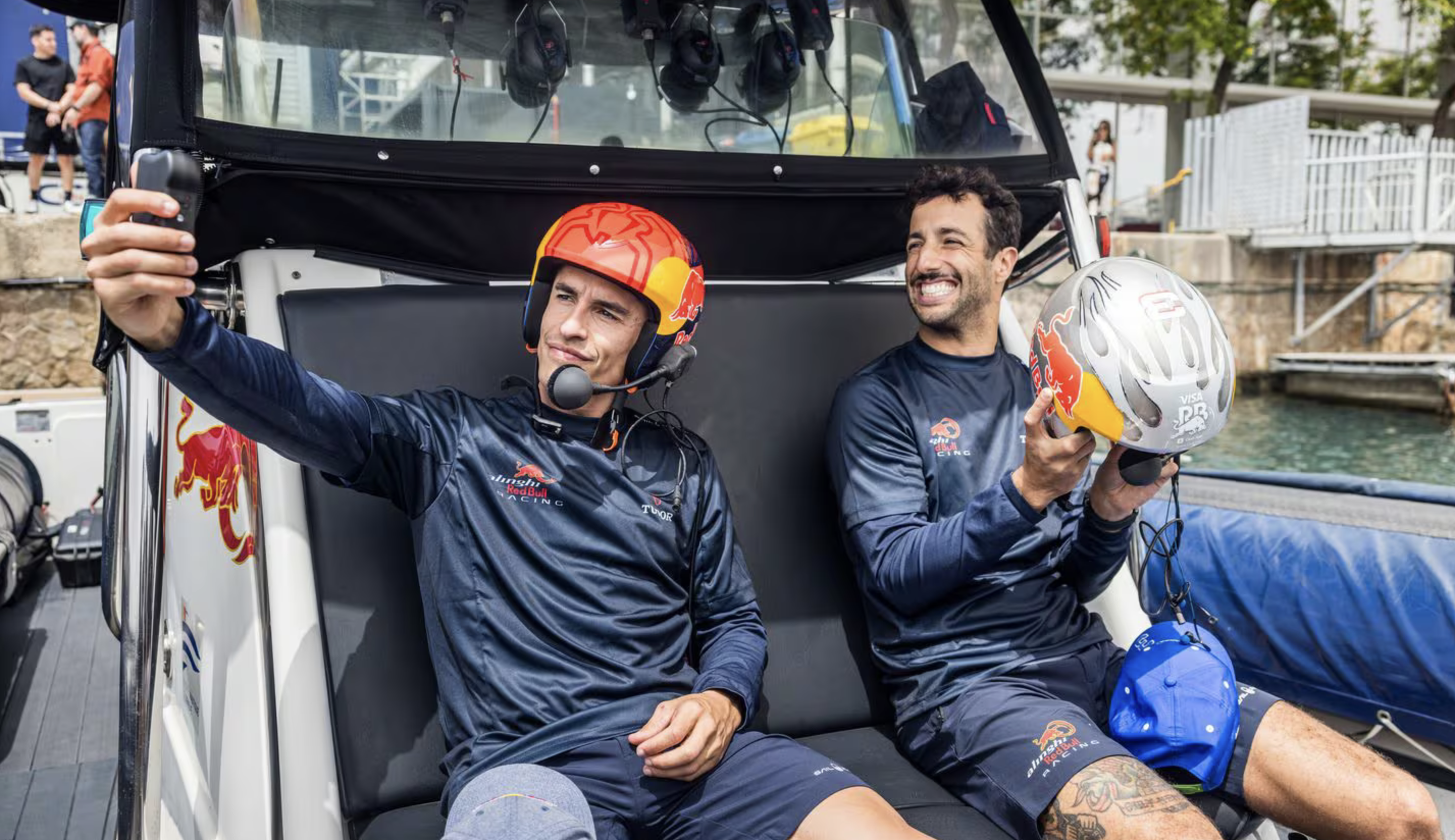 Marc Marquez, multiple champion du monde de MotoGP, et Daniel Ricciardo, multiple vainqueur en F1, ont tous les deux troqué la piste pour la mer à l’occasion d’une course de voile à grande vitesse à Barcelone avec l’équipe de la Coupe de l’America Alinghi Red Bull Racing.