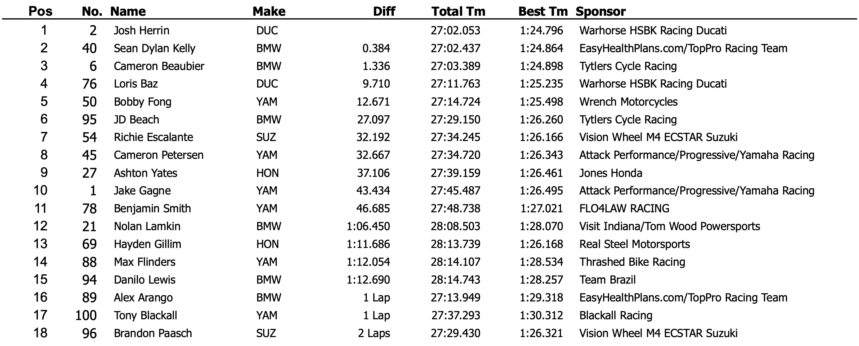 À deux tours de la fin, Herrin a dépassé Kelly en allant au virage 1, avant de baisser sa visière pour foncer vers le drapeau à damier sans se retourner. Avec quatre victoires en cinq courses, il étend naturellement son avance au championnat.