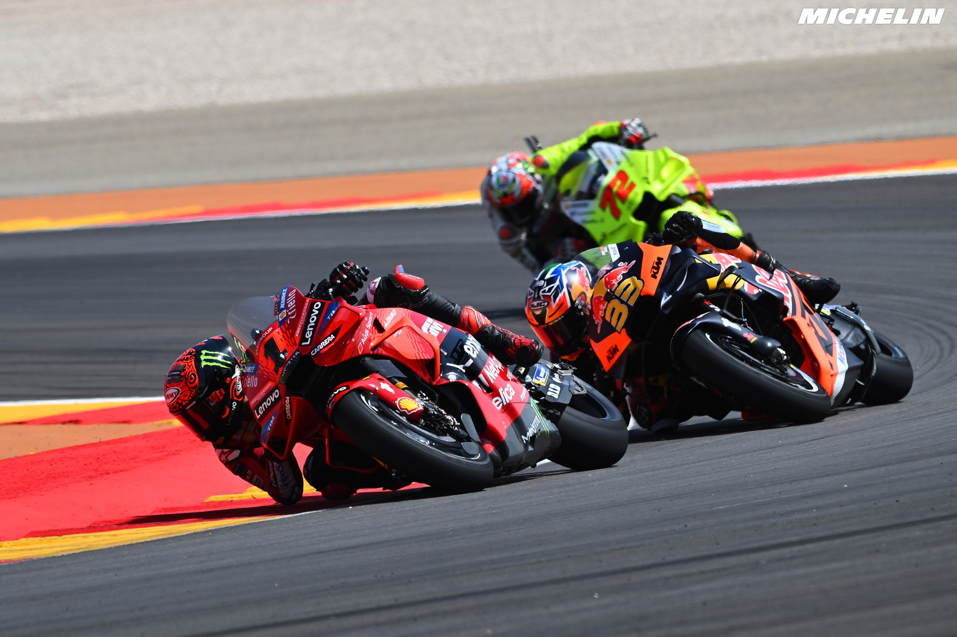 Le dimanche de Pecco Bagnaia à Aragon ne s’est certainement pas terminé comme il l’aurait souhaité. Auteur d’un départ catastrophique, le champion du monde en titre a réalisé une belle deuxième partie de course, pour revenir dans le sillage d’Alex Marquez et ainsi tenter de lui arracher un podium. Le duel entre les deux hommes s’est toutefois soldé par un accrochage qui aurait pu être bien plus coûteux pour le n°1…