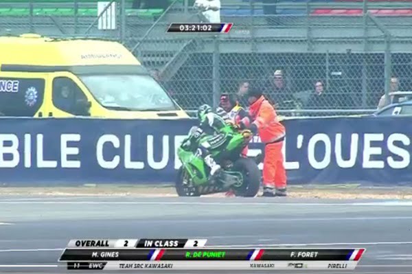 Randy de Puniet réduisait son retard sur Broc Parkes de 10 secondes à 2.4, mais il chutait dans le virage du Raccordement sans gravité. Il ramenait sa ZX-10R à son stand. La Yamaha GMT94 et la Suzuki du SERT profitaient de son immobilisation pour le doubler.