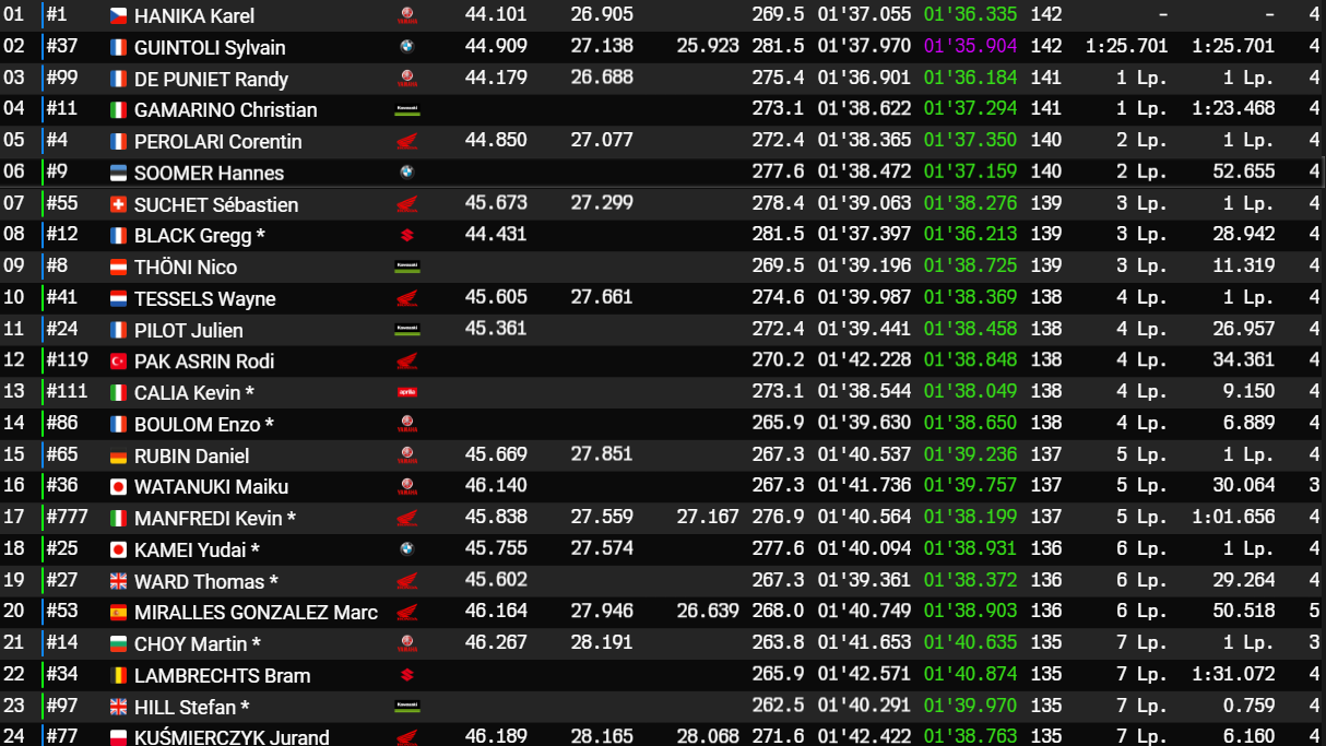 Toutefois, alors qu’il maîtrisait son sujet, Gregg Black a chuté, et a ensuite pris la piste à contre-sens. La Yamaha n° 1 du Yart est donc repassée en tête. Après avoir passé le relais à ses équipiers, Karel Hanika mène à nouveau la danse au guidon de la Yamaha.