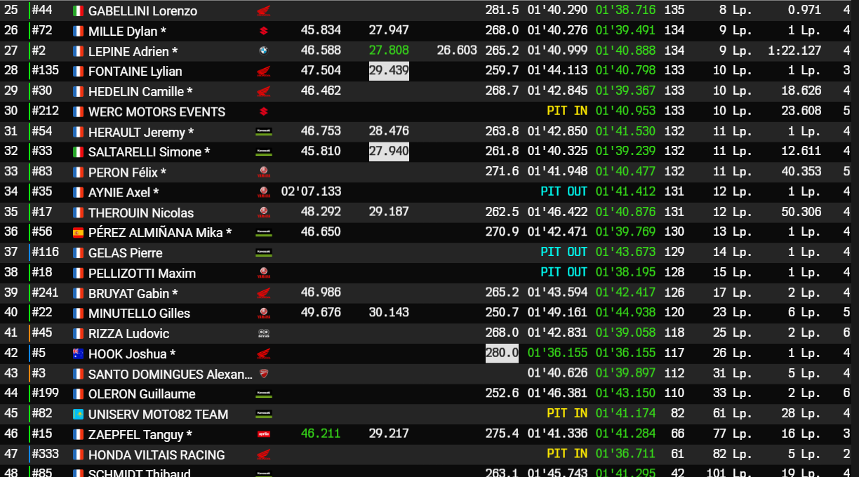 Dans la dernière catégorie engagée aux 24H Motos, la n°45 est repassée devant la n°3. Ludovic Rizza pointe actuellement à la 41e place du classement général, à 25 tours de la tête.