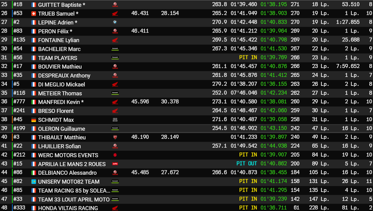Derrière, la n°12 se remet d’une après-midi mouvementée et poursuit sa remontée dans le peloton. Désormais quatrième, Etienne Masson pointe à une quarantaine de secondes d’une place sur le podium, actuellement défendu par Christian Gamarino au guidon de la n°11. La fatigue entre désormais en jeu et les fautes de déconcentrations se multiplient : rien n’est encore joué.
