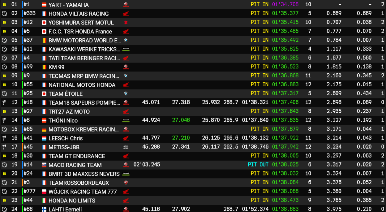 Premier pilote à prendre la piste pour son équipe lors des Essais qualificatifs 1, Niccolo Canepa a signé le meilleur chrono de la séance avec la n°1 Yart-Yamaha. Alors que l’Italien a bouclé un tour du circuit Bugatti en 1:34.708, son équipier, Karel Hanika – également premier de son groupe – a tourné en 1:34.878 lors de la séance réservée aux pilotes Rouges. Enregistrant la meilleure moyenne de la qualification de ce vendredi, les deux hommes propulsent la n°1 en pole position provisoire.