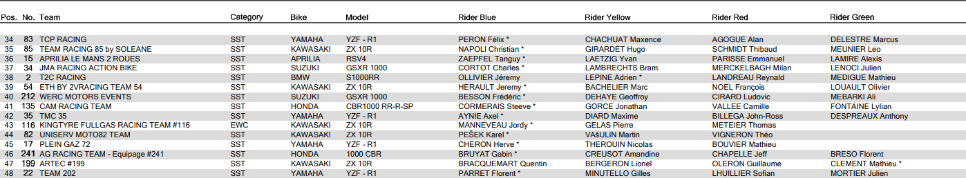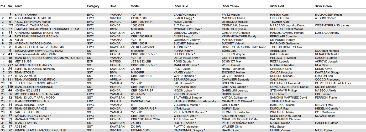 Pour rappel, trois catégories sont engagées aux 24 Heures Motos. Ainsi 31 équipages animeront la catégorie reine, Formula EWC. Tandis que 15 et 2 machines prendront la piste dans les catégories Superstock et Experimental.
