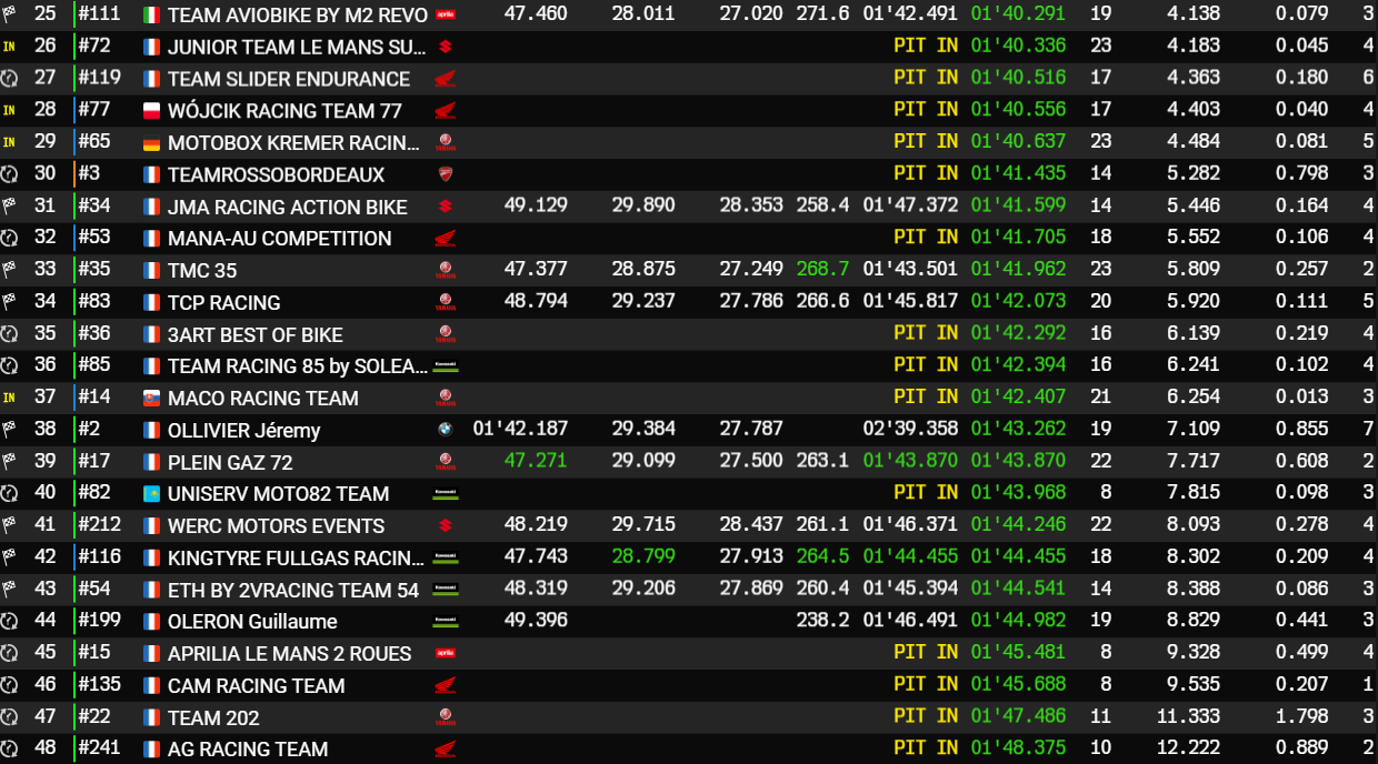 À noter, la chute de Gabin Buryat sur la Honda n°241 (AG Racing), ainsi que celle de Ben Luxton (n°27 – TRT24 AZ Moto).