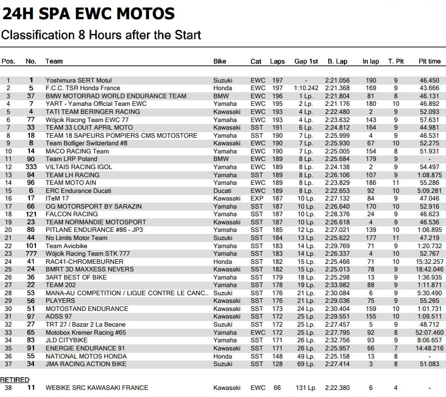 Classement après 8 heures (avant la pénalité):