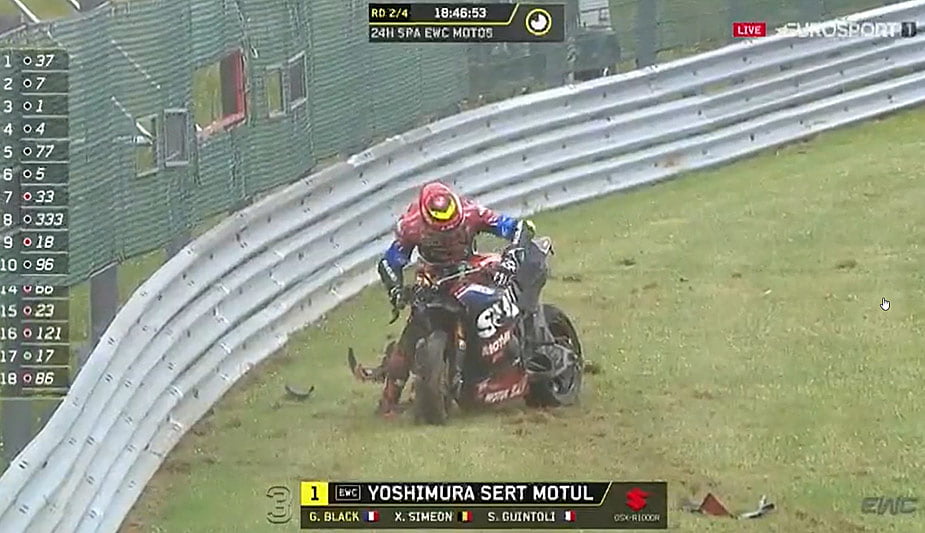 😰They are crashing one by one as the track is wet. The #1 and the #5 lost the grip while they were attacking hard to catch up. #FIMEWC #24hSPAMotos pic.twitter.com/NaVzgk6OMq