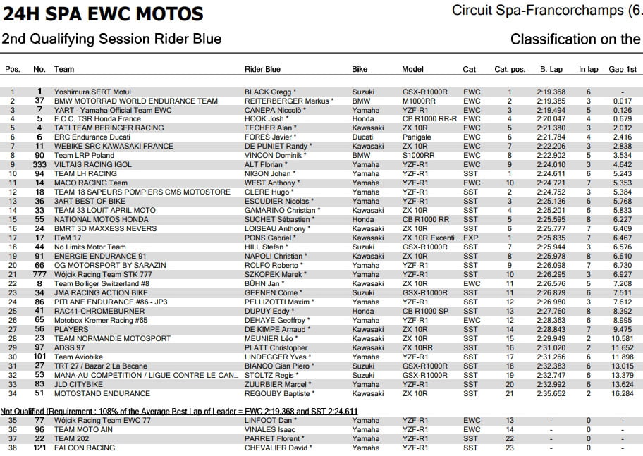 Après une séance quelque peu indécise hier, où l’équipe officielle Yamaha a réalisé le meilleur temps grâce à Karel Hanika suite à une annulation de temps de Markus Reiterberger sur la BMW Motorrad World Endurance Team, le ton est d’emblée donné dès la séances de 20 minutes des pilotes bleus, Gregg Black plaçant la Suzuki GSX-R1000R du Yoshimura SERT Motul au premier rang grâce à un chrono en 2’19.368 devant Markus Reiterberger sur la BMW M1000RR du BMW Motorrad World Endurance seulement 11 millièmes moins rapide !