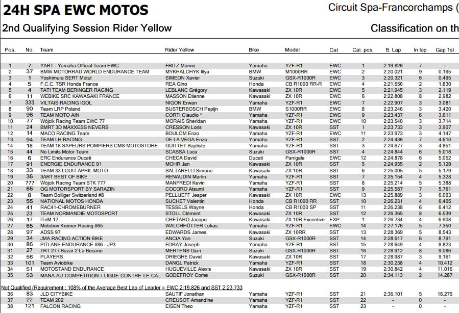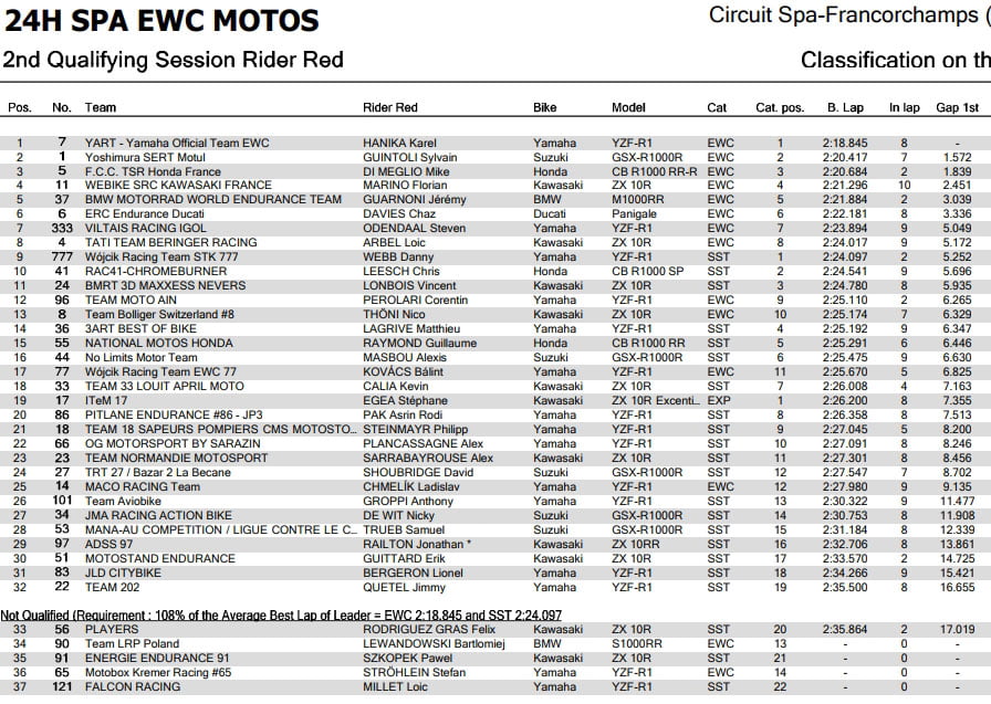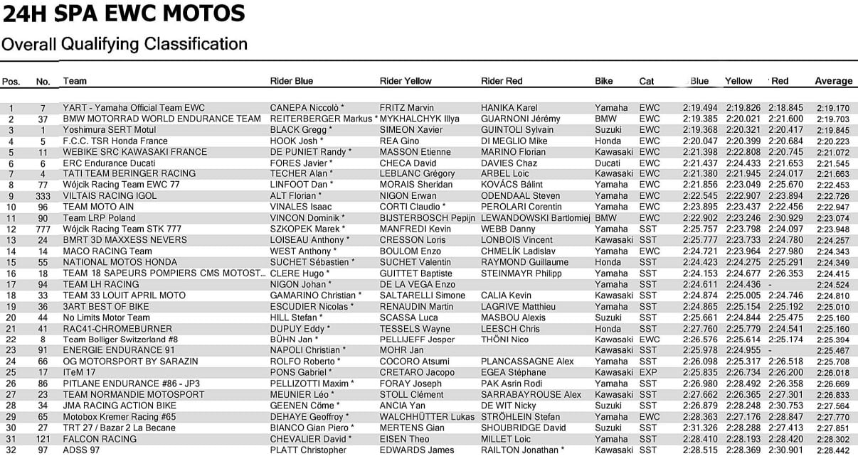Karel Hanika (YART – Yamaha Official Team EWC) : « Mon équipe a préparé une excellente moto et mes coéquipiers roulaient avant moi. Ils m’ont dit comment était la situation sur la piste et m’ont aidé à préparer la moto pour le tour parfait. Pour ma part, je cherchais juste à faire un tour propre et c’est ce que j’ai réussi à faire dans les dernières minutes. Je n’ai pas fait d’erreur, j’ai essayé de trouver mes trajectoires et la moto fonctionnait bien. Je pense qu’il était possible de faire mieux d’un ou deux dixièmes, mais c’est sûr que vous êtes toujours à la limite chaque fois que vous allez en qualification. Vous êtes à 100 % dans ces moments-là et j’ai fait du mieux que je pouvais. Bien sûr, nous allons essayer de gagner, c’est notre principal objectif à chaque fois que nous participons à une course. Nous avons travaillé dur depuis la dernière course au Mans pour améliorer les choses qui nous posaient problème et nous pensons que c’est maintenant bien réglé. Nous prenons plaisir à rouler ici à Spa, c’est un super circuit, nous prenons beaucoup de plaisir et c’est génial de partager la moto avec mes coéquipiers. Merci à mon équipe, ils ont fait un travail incroyable, et nous avons à nouveau la pole position. Je suis très heureux. »