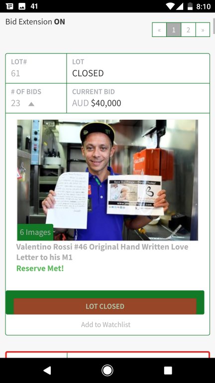 Le lien ci-dessous vous permettra de prendre connaissance des prix atteints pour les 102 lots mis en vente, comme par exemple une casquette signée Jack Miller à 360 $ australiens, un cuir de Wilco Zeelenberg à 2482 $ australiens ou la fameuse lettre écrite par Valentino Rossi à sa Yamaha à 40 000 $ australiens.