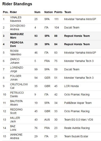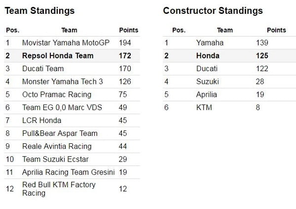 Cette année, les Honda ont été bousculées en début de saison par les Yamaha, puis plus récemment par les Ducati. Cela n’a pas empêché Marquez de s’imposer au Texas et Pedrosa à Jerez. Mais ils comptent deux abandons chacun, et ne pointent qu’en troisième et quatrième positons au classement général, avec respectivement  88 et 84 points.