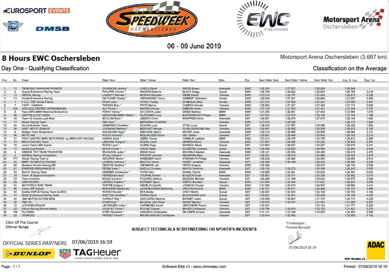 Après avoir dominé les essais libres grâce à Jérémy Guarnoni, le Team SRC Kawasaki France décroche la pole provisoire à la moyenne des meilleurs temps de ses trois pilotes, Jérémy Guarnoni, David Checa et Erwan Nigon. L’équipe Kawasaki officielle vise de prendre le maximum de points en Allemagne, les 5 points bonus de la pole position et les 30 points de la victoire aux 8 Hours of Oschersleben.