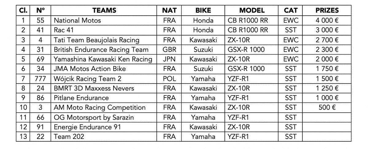 La première édition des 8 Hours of Sepang a été une course éprouvante et difficile en raison de conditions météo sur la Malaisie. Au guidon de la Honda National Motos, le Français Valentin Debise et le Japonais Hikari Okubo ont déjoué les pièges d’une piste détrempée en début de course pour s’imposer pour la première fois en EWC Dunlop Independent Trophy. Cette équipe historique en Endurance, victorieuse au Bol d’Or 2006, est de retour sur l’intégralité de la saison FIM EWC. National Motos reçoit les 4 000 € alloués au vainqueur à Sepang. Il devance une autre Honda, celle du RAC 41 engagée en Superstock et pilotée par Guillaume Antiga, Wayne Tessels et Maxime Bonnot. RAC 41 reçoit 3 000 € accordés en EWC Dunlop Independent Trophy.