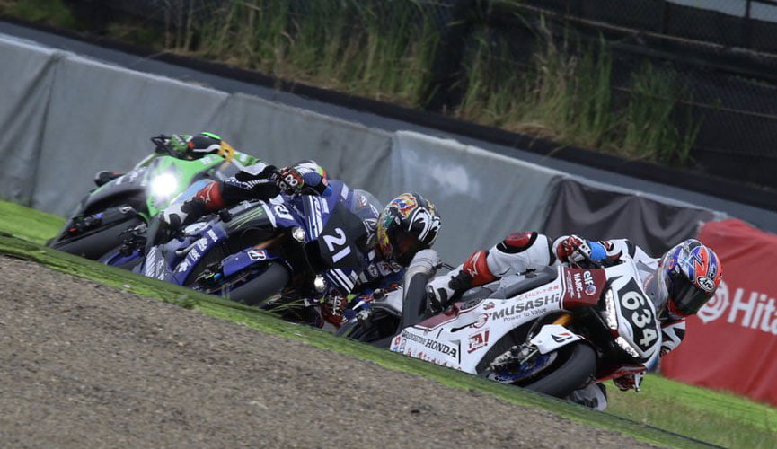 Au baissé du drapeau, c’est la Kawasaki du team Green menée par Haslam qui prend la tête devant devant la Honda Musahi et la Yamaha numéro 21 pilotée par Nakasuga.