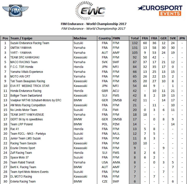 En effet, les 8 Hours of Slovakia Ring ont resserré les positions en tête du championnat du monde FIM EWC 2016-2017. Un seul point sépare maintenant le Suzuki Endurance Racing Team et le GMT94 Yamaha. Le YART Yamaha Official EWC Team peut aussi encore emporter le titre.