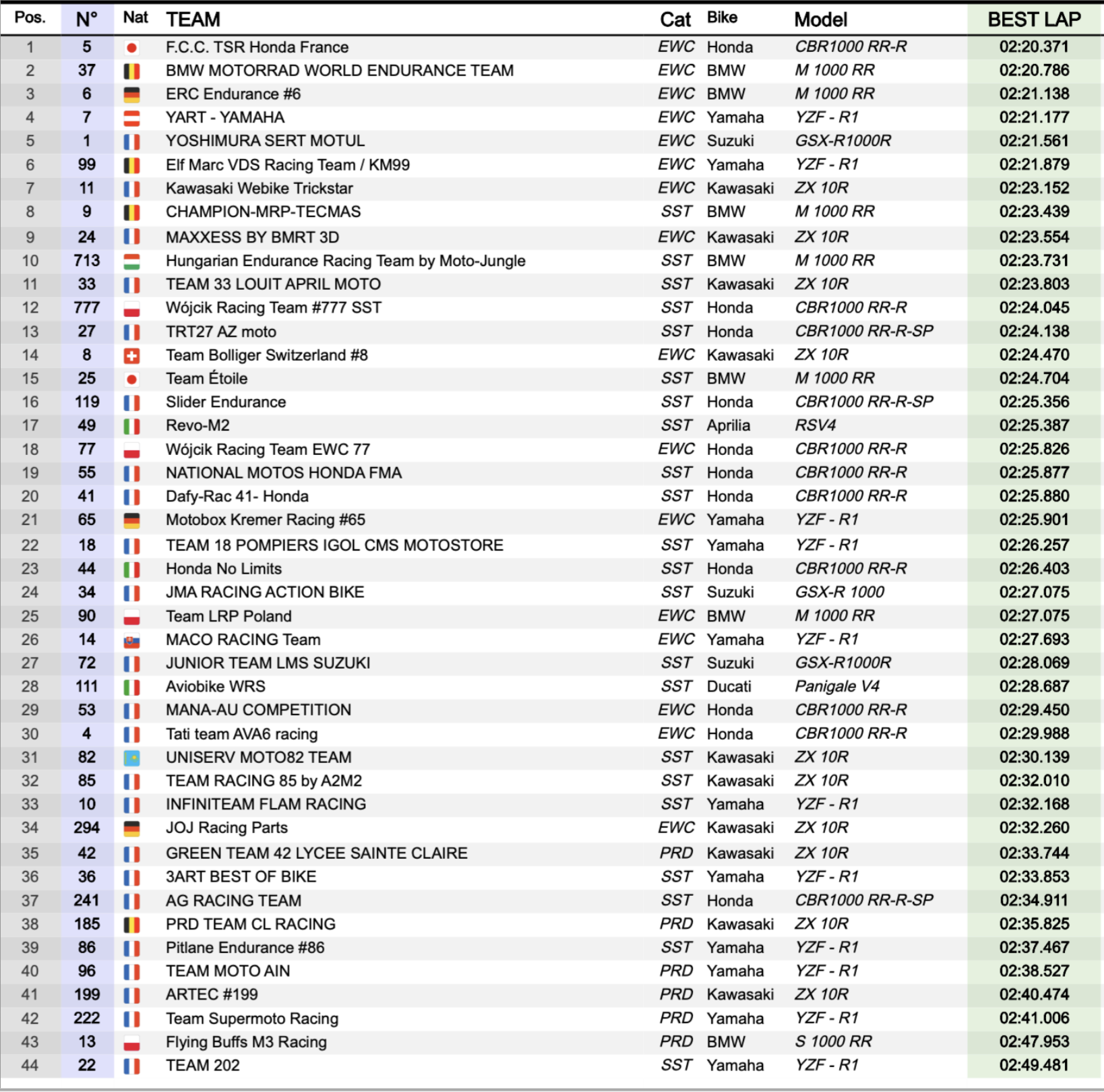 C’est la Honda n°5 du F.C.C. TSR Honda France qui s’est montrée la plus rapide, signant le meilleur temps de la séance en 2:20.371. Derrière la Honda, la BMW n°37 du BMW Motorrad World Endurance Team pointe à 0.415 seconde, prouvant que la formation belge sera à surveiller de près sur ses terres. La n°6 de ERC Endurance complète le top-3.