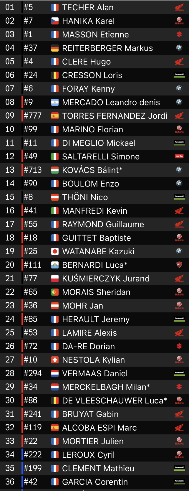 Après les premiers stops des leaders, la hiérarchie change quelque peu. Alan Techer reprend la tête au guidon de la Honda n°5, prise en chasse par la Yamaha n°7 de Karel Hanika. Étienne Masson complète le podium provisoire sur la n°1.