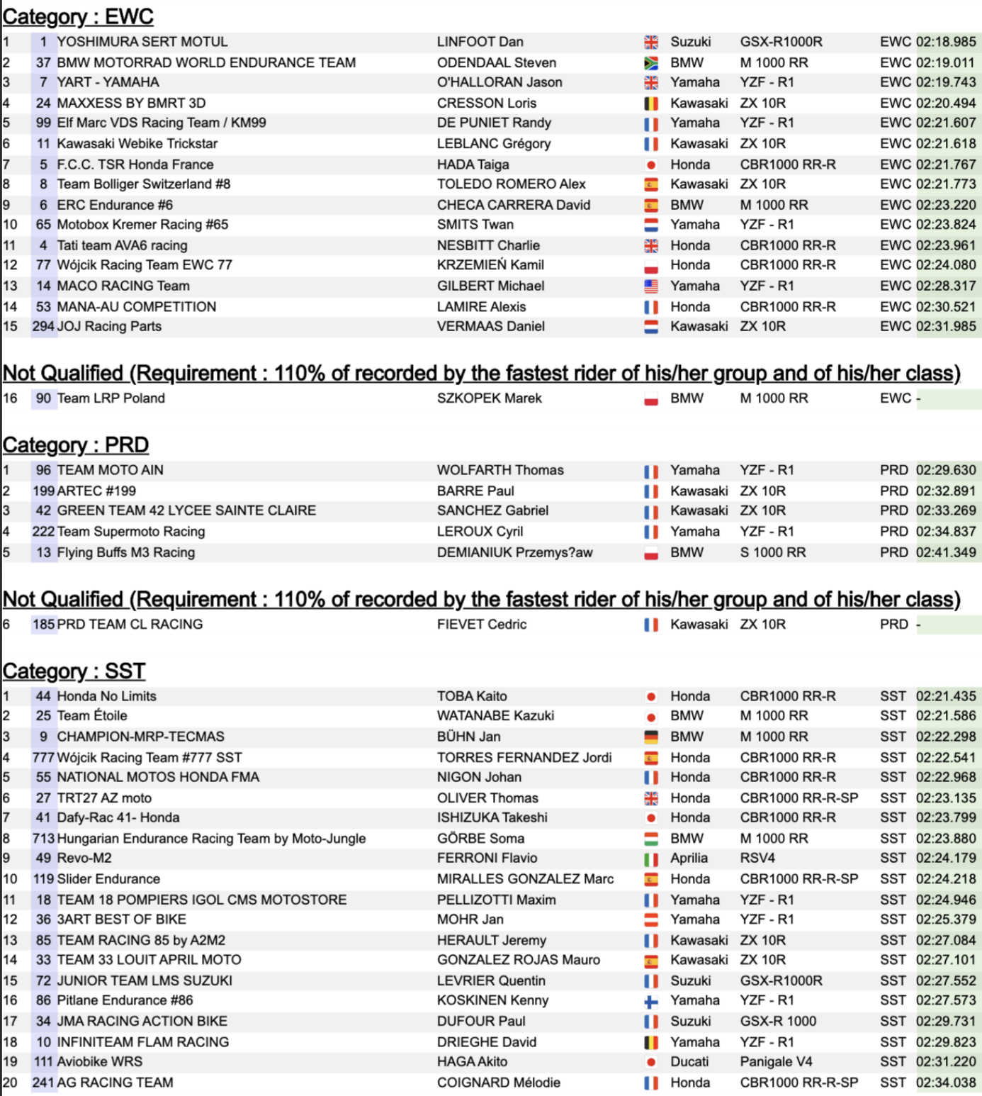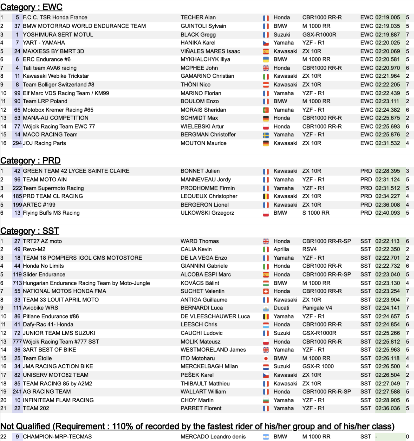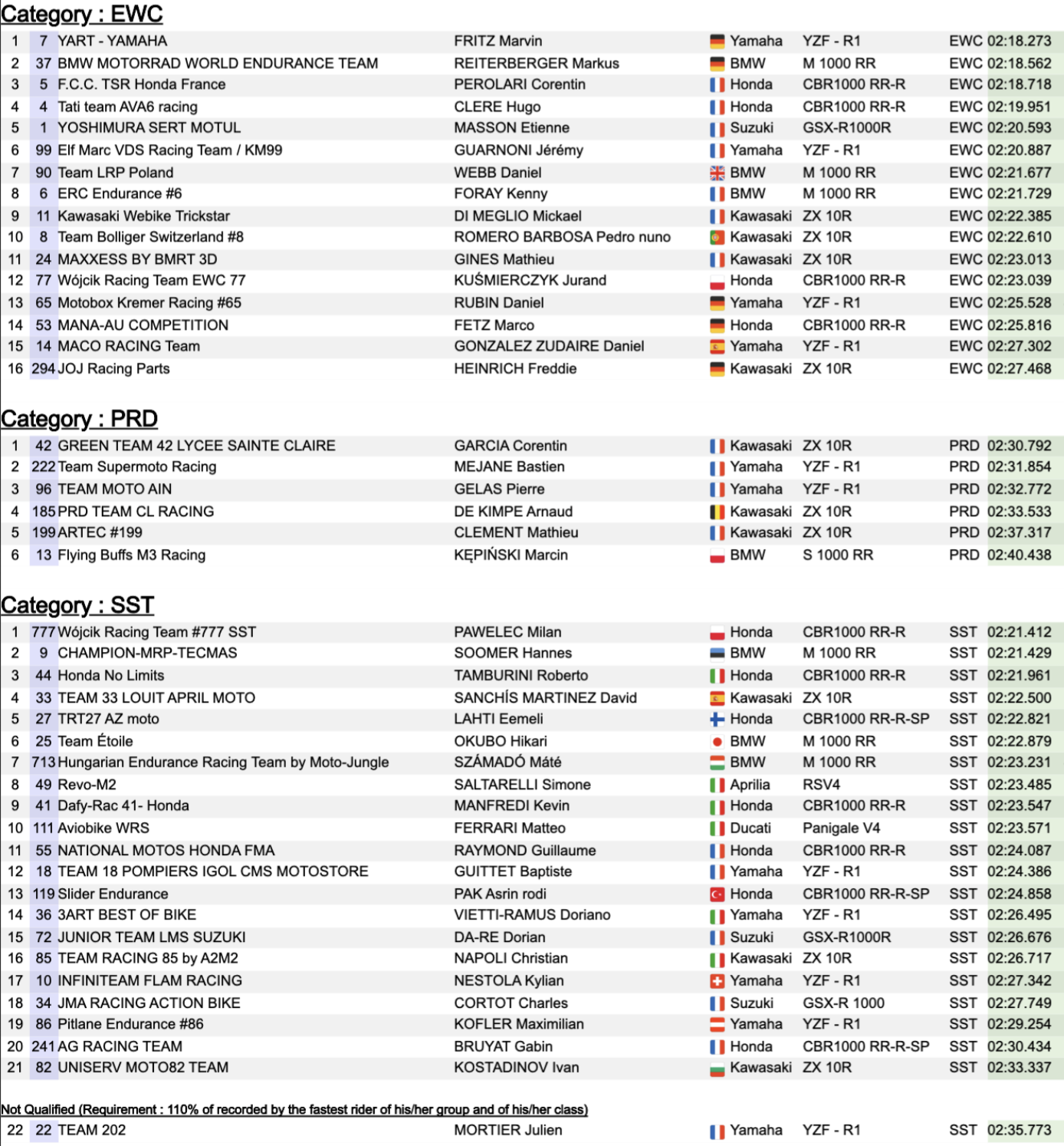Pour l’instant, c’est la BMW n°37 qui détient les commandes du classement combiné, quelques dixièmes seulement devant la Honda n°5, la plus rapide lors des Essais. La n°7 du Yart (Yamaha) complète le top-3 provisoire. Côté Superstock, Honda No Limits prend la pole provisoire devant Champion-MRP-Tecmas et Wójcik Racing Team.