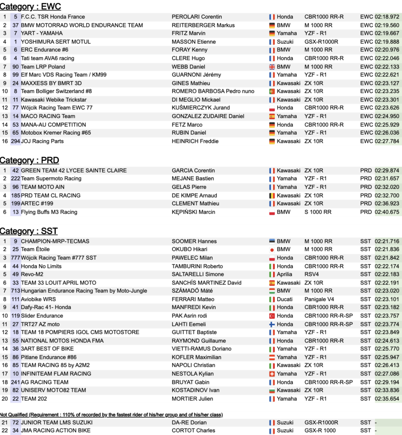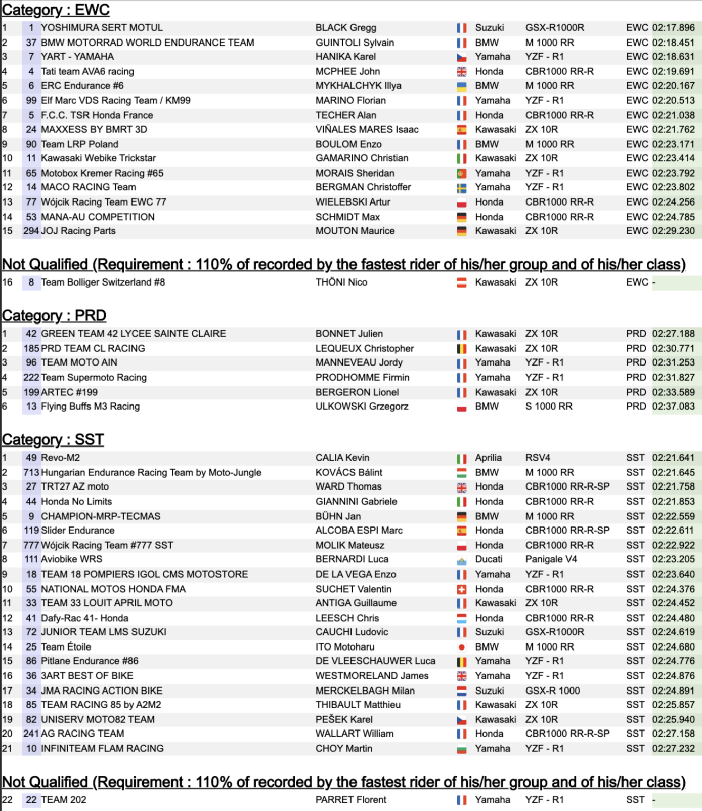 Derrière ce trio de tête, John McPhee (Tati team AVA6 racing, Honda) et Illya Mykhalchyk (ERC Endurance #6, BMW) complètent le top 5, tous à 2,3 secondes du meilleur temps. Florian Marino place la Yamaha du team belge Elf Marc VDS Racing Team/KM99 en sixième position. Cette séance a confirmé la montée en puissance de Suzuki et BMW, tandis que la lutte reste très ouverte pour la pole dans la catégorie EWC.