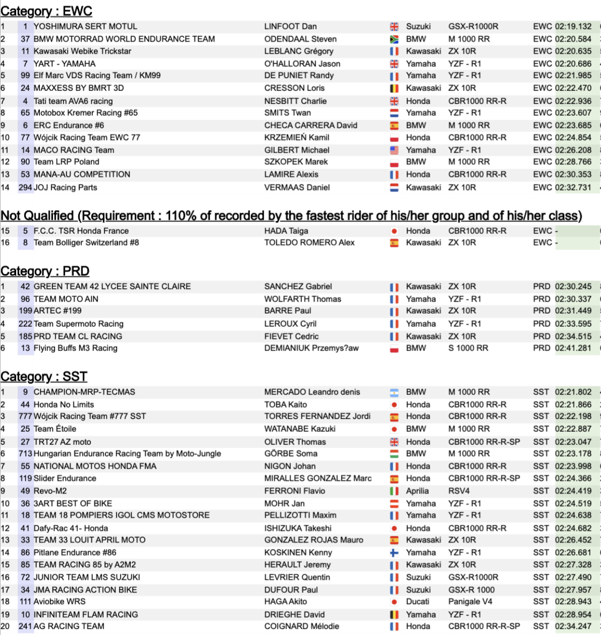Dans la catégorie EWC, Dan Linfoot et le Sert arrachent le meilleur temps en 2:19.132. Steven Odendaal place la BMW Motorrad World Endurance Team à la deuxième place en 2:20.584, à 1,452 seconde, tandis que Grégory Leblanc hisse la Kawasaki Webike Trickstar sur la troisième marche en 2:20.635, à seulement 0,051 seconde de la BMW. Jason O’Halloran (YART Yamaha) suit de près avec un tour en 2:20.686, alors que Randy de Puniet place la Yamaha du team belge Elf Marc VDS Racing Team/KM99 en cinquième position (2:21.985).