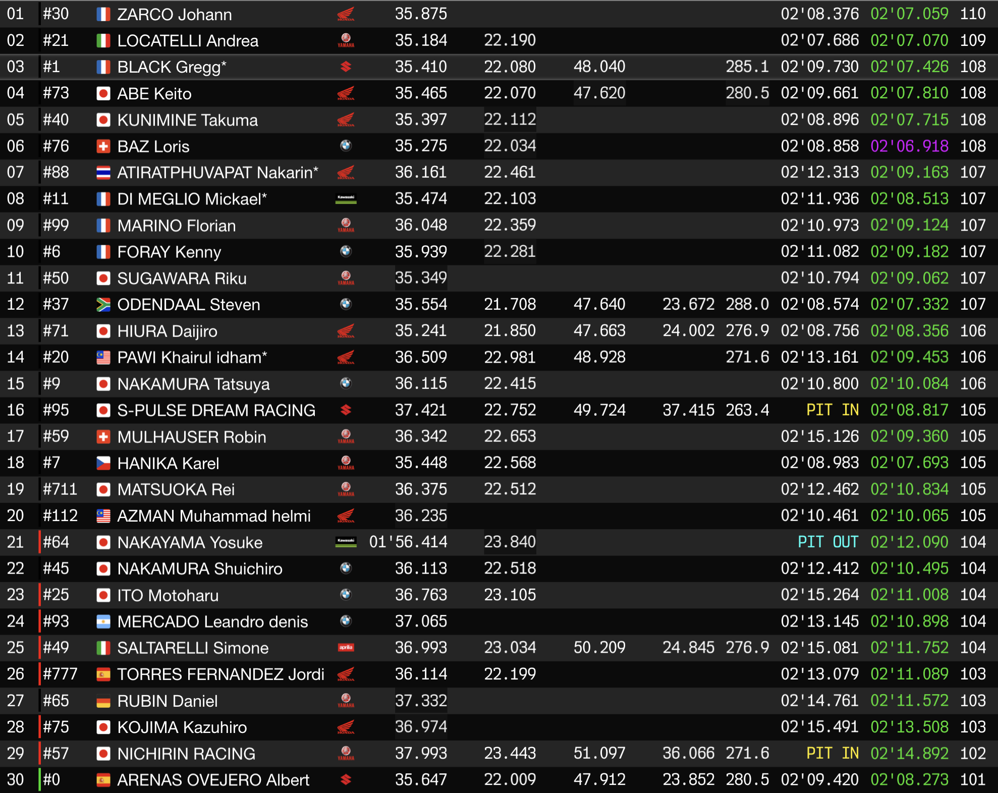 À ce stade de la course, la Suzuki n°1, emmenée par Greg Black, complète le top-3 provisoire. Derrière, le Français, Loris Baz, fait partie des pilotes les plus rapides en piste. Il parvient ainsi à insérer la BMW n°76 dans le top-5.