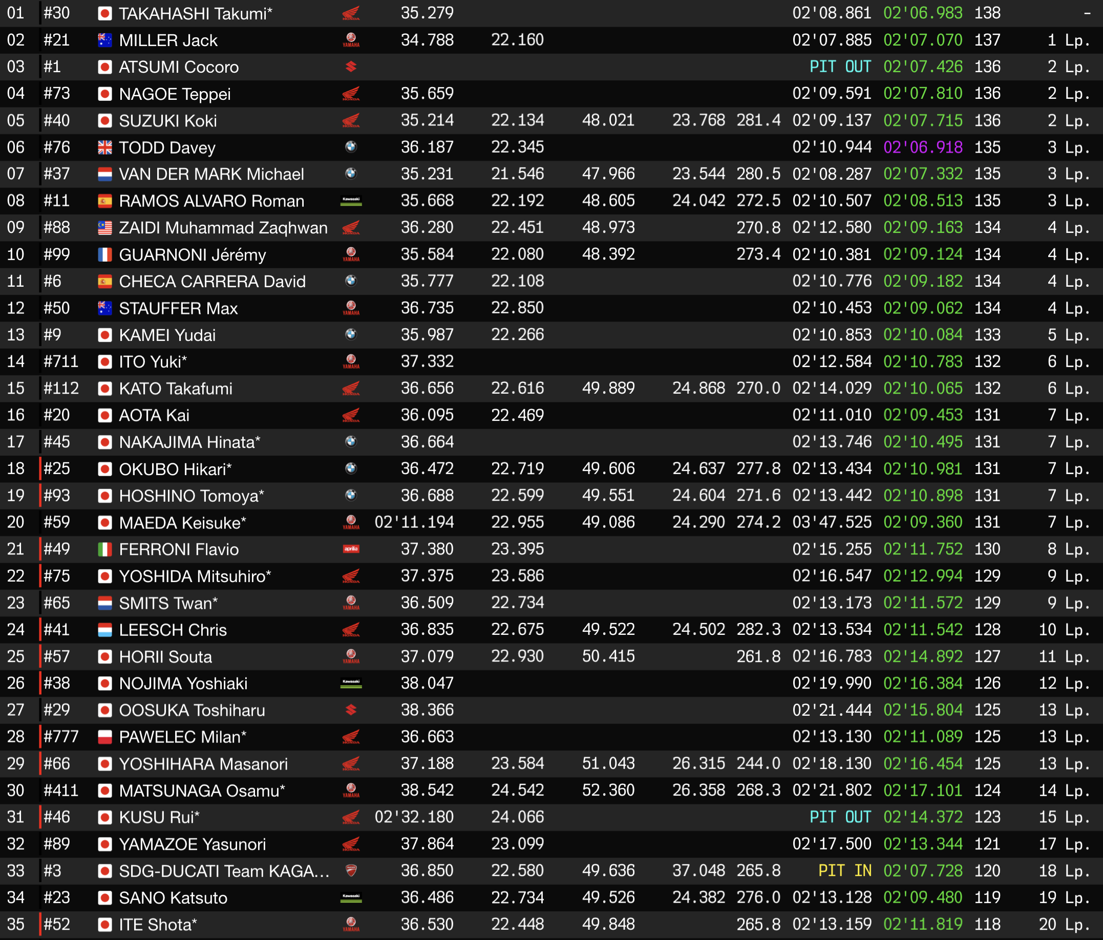 À mi-parcours de la cinquième heure, les arrêts aux stands s’enchaînent et rythment la course. L’équipe Harc-Pro Honda fait partie des premières à effectuer son ravitaillement. À ce stade de l’épreuve, la Honda d’usine occupe toujours la tête, grâce à Takumi Takahashi. Le Japonais conserve un bel avantage mais voit sa marge se réduire lentement.