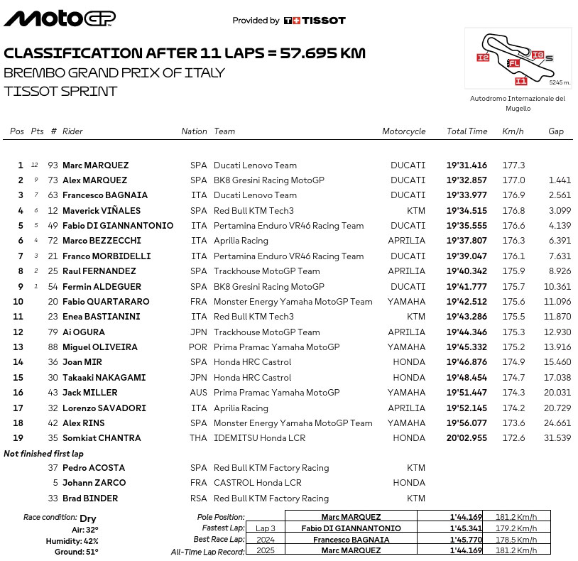 Résultats du Sprint du Grand Prix d’Italie MotoGP 2025 :