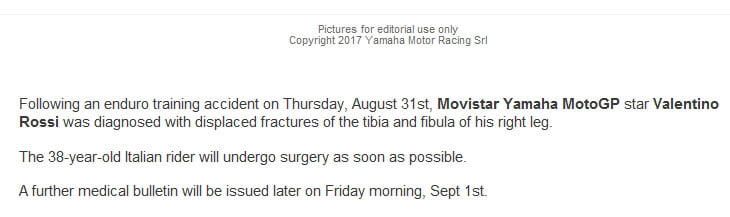 Toujours selon la presse italienne qui suit l’affaire de minute en minute, les premiers tests médicaux ont confirmé la gravité des dégâts subis par le pilote Yamaha.
