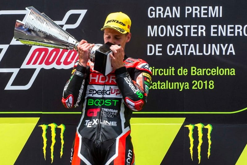 En Moto2 : « Victoire impeccable du pilote AMV Fabio Quartararo ! Grosse course du Français qui décroche sa première victoire dans le Mondial. Chapeau, Fabio ! Il a été vraiment fort tout au long du week-end, c’est un tracé qui lui plaît beaucoup et, après la pole du samedi, il a pris les rênes de la course en imposant un gros rythme. Au final, il réalise le meilleur tour de course et gagne. C’est un excellent résultat pour lui, cela va lui apporter de la motivation et de la confiance en plus afin d’affronter le reste de la saison. Nous voyons enfin un autre Fabio, un pilote dont on attendait beaucoup et qui semble avoir trouvé le petit truc qui lui manquait. Le Moto2 est une catégorie difficile et très disputée. Ensuite, Miguel Oliveira et Álex Márquez ont terminé deuxième et troisième de ce Grand Prix, où trois châssis ont été représentés sur le podium : Speed Up, KTM et Kalex. »
