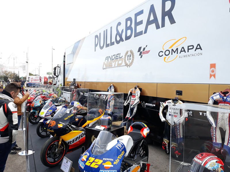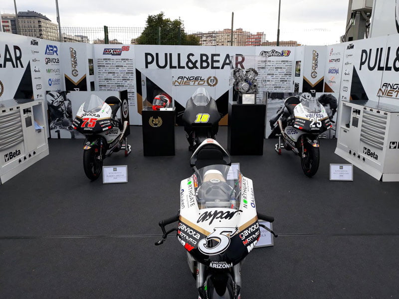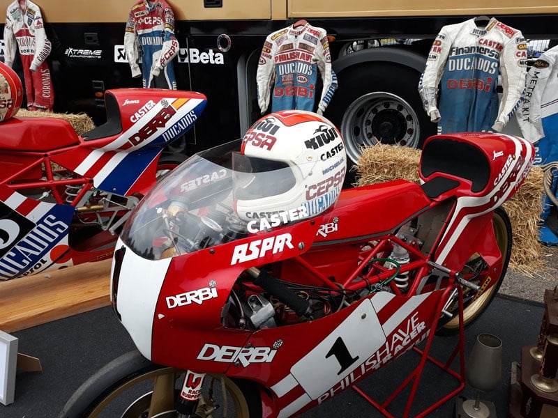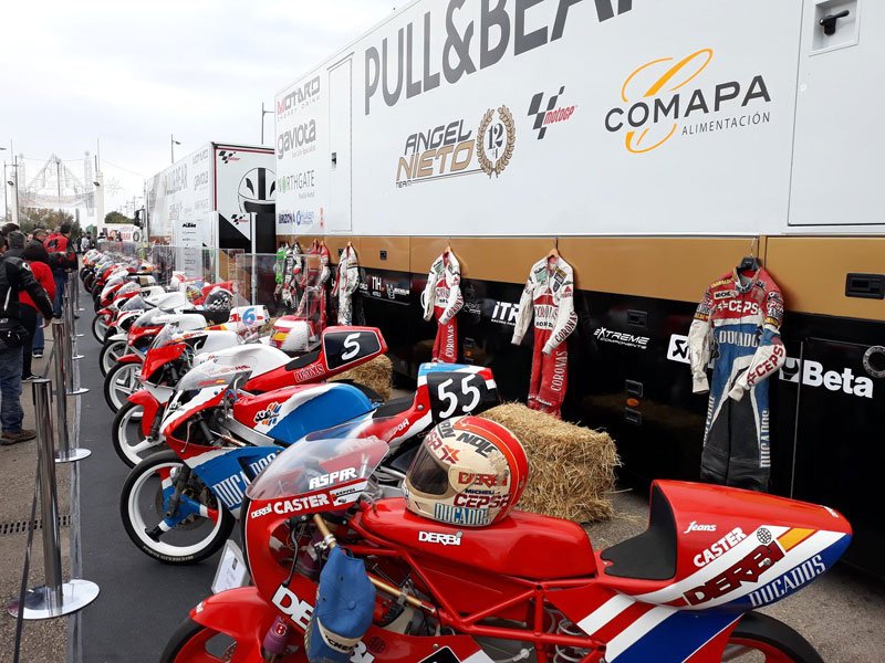 Aspar a ensuite passé en revue ses 40 ans de sport automobile avec des fans et des amis, entourés de ses vieux cuirs, trophées et motos. La Derbi de 1986 avec lequel Aspar a remporté son premier titre mondial était présente, ainsi que les motos Aprilia 125cc qu’il gérait en tant que chef d’équipe pour Alvaro Bautista, Gabor Talmacsi, Julian Simon et Nico Terol.
