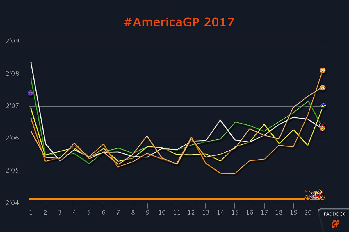 Toujours est-il que pendant la moitié de la course, tous les pilotes de tête ont eu sensiblement le même rythme et ce n’est que vers le 13e tour que l’on voit Johann Zarco et Cal Crutchlow commencer à ralentir alors qu’à l’inverse, Marc Márquez révèle son vrai potentiel et creuse l’écart avec la concurrence.