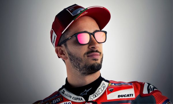 Comme le précise ce sponsor oculaire, « Andrea Dovizioso, pilote de Ducati MotoGP, a créé son propre modèle de lunettes de soleil, le DA9001, un modèle élégant et carré, fini en noir mat avec des intérieurs rouges – les couleurs emblématiques de Ducati – avec son nom gravé sur le dessus. »