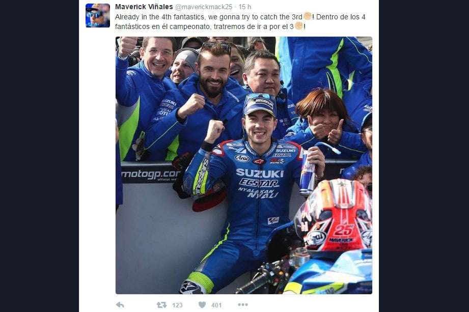 Maverick Vinales a déclaré sur Twitter qu’il allait essayer de doubler Jorge Lorenzo au classement du Championnat du monde: « Déjà dans les 4 Fantastiques, nous allons essayer de rattraper le 3e ».