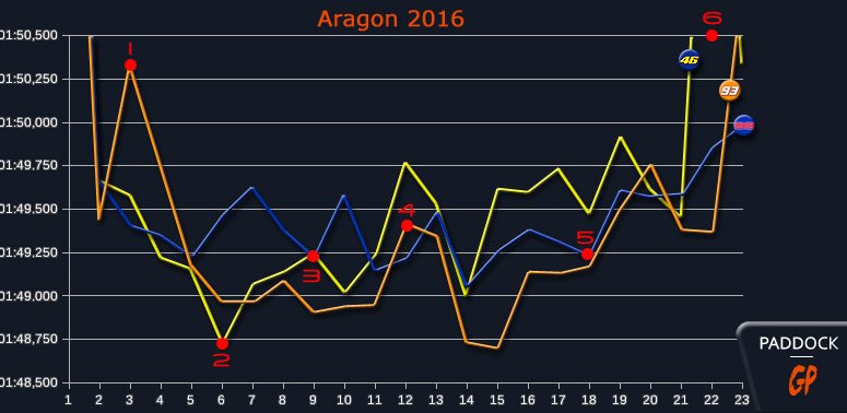 Pendant ce temps, Valentino Rossi fait la plus belle entame de course mais il tape peut-être dans ses pneus et devra progressivement baisser son rythme avant de commettre une erreur en fin de course.