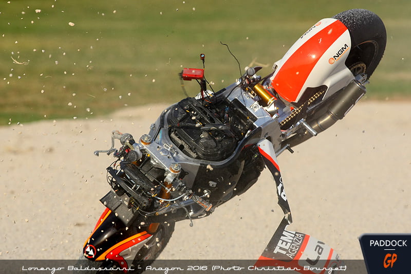 A 9h13, lors du warm up Moto2 en Aragon, Lorenzo Baldassarri a subit une grosse chute qui a complètement détruit sa Kalex au virage #2.