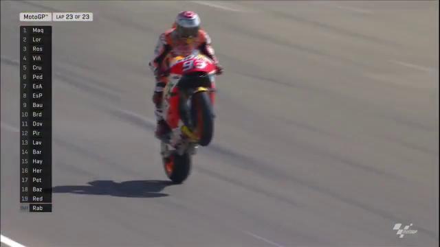 Une allure irrésistible qui l’amènera vainqueur à l’arrivée devant un Lorenzo qui met un point d’honneur à devancer le Doctor. Ce dernier a pourtant tout tenté pour éviter ça, allant jusqu’à faire une faute qui ne le privera cependant pas du podium.