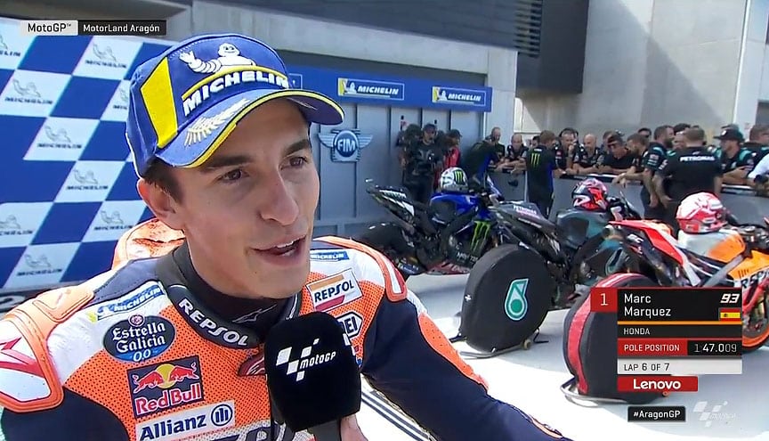 A peine descendu de sa Honda RC213 officielle après avoir obtenu la pole position du Grand Prix d’Aragón, Marc Márquez s’est confié devant la caméra du site MotoGP.com avec des sentiments un peu partagés...