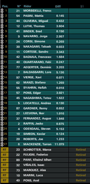 A la mi-course, où l’on observe la hiérarchie Morbidelli, Pasini, Oliveira, Luthi, Corsi, Binder, Navarro, Cortese, Nakagami, Bagnaia, Aegerter, Schrotter et Quartararo, l’écart n’est plus que de 6/10 entre les deux premiers pilotes.