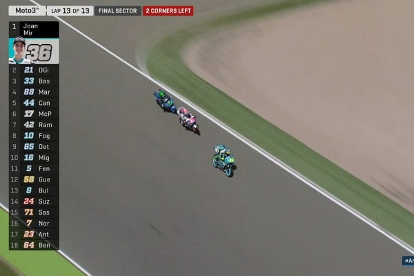 Après avoir réussi à prendre la tête à l’entame du dernier tour, le leader du Championnat du Monde Joan Mir a essayé de creuser l’écart sur ses poursuivants pour pouvoir l’emporter avec une petite marge d’avance. Mais sa tactique n’a pas fonctionné, et il s’est retrouvé au début de la longue ligne droite avec Fabio di Giannantonio et Enea Bastianini juste derrière lui.