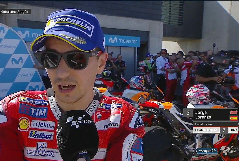 A peine descendu de sa Ducati GP17 officielle après avoir rallié l’arrivée du Grand Prix d’Aragon en 3e position, Jorge Lorenzo s’est confié au micro du site MotoGP.com après avoir mené la majeure partie de la course.