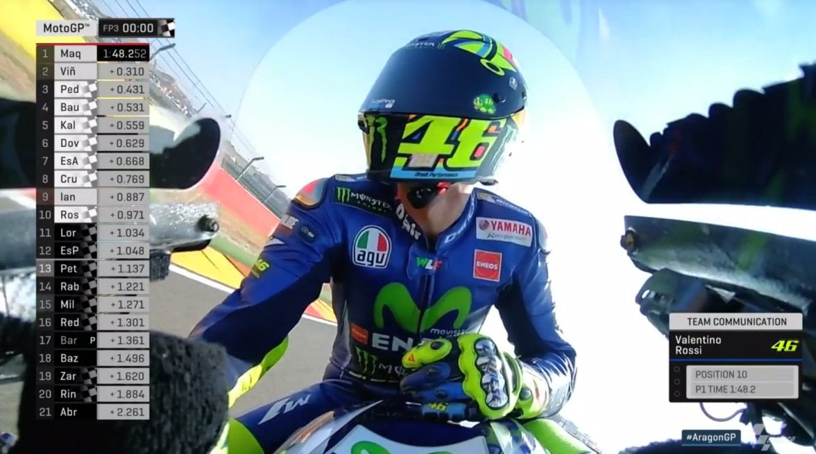 À cinq minutes de la fin de séance, Valentino Rossi s’arrête pour faire remonter un deuxième pneu neuf arrière tandis que Marc Márquez se lance dans un tour rapide qui lui fait reprendre le commandement en 1’48.252, juste devant un Maverick Viñales revigoré.