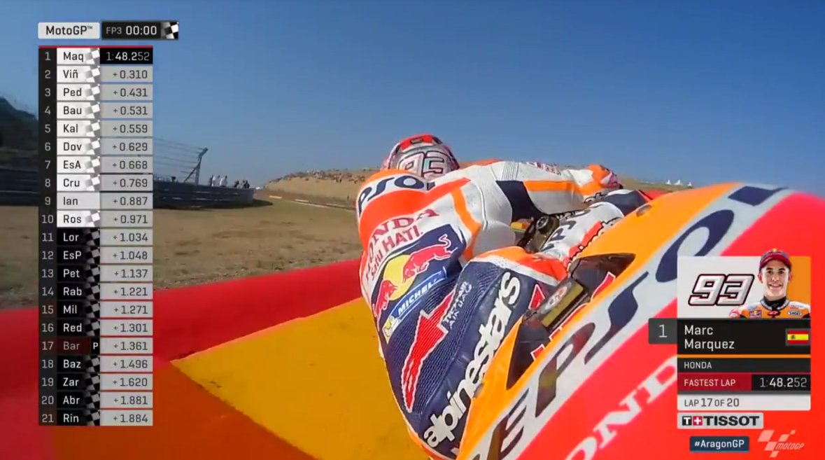Marc Márquez (tendre avant/médium arrière) s’empare du commandement en 1’49.411 avant la fin d’un premier run où la hiérarchie du top 10 s’établit comme suit : Márquez, Crutchlow, Kallio, Aleix Espargaro, Vinales, Zarco, Miller, Pedrosa, Pol Espargaro et Ianonne.
