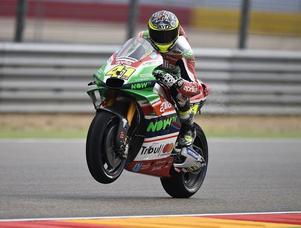 Mais il n’a pas pour autant baissé les bras chez Aprilia, dont il commence à maîtriser la machine. Il vient de réussir ce vendredi le septième chrono sur la piste détrempée de MotorLand, ce qui a été un résultat magnifique, surtout si l’on tient compte de la neuvième place de son coéquipier Aleix Espargaro, la meilleure référence car à matériel à peu près égal, et en sachant que l’Espagnol au poignet droit généreux a toujours à cœur de briller devant les siens lors de ses quatre Grands Prix nationaux.