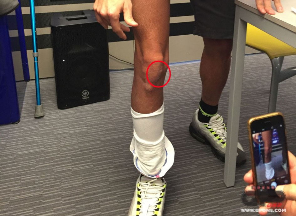 « Les gars, pensez un peu ce que vous voulez, je ne peux rien faire! «  a-t-il répondu en riant, mais également en relevant la jambe de son short et en baissant la protection de sa jambe pour montrer la zone où on lui a introduit un clou pour immobiliser la fracture du tibia.