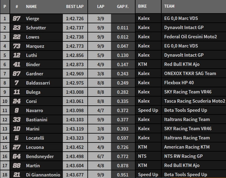 Le combat des chefs va maintenant pouvoir commencer. En 1’42.726, Vierge signe le chrono le plus rapide du week-end vu jusque-là. C’est le nouveau record de la piste, tenu depuis 2015 par Johann Zarco avec un moteur 600 Honda qui était de 1’42.809. Il est suivi par son équipier Álex Márquez. Brad Binder, Lüthi et Gardner complètent le top 5 à sept minutes du terme.