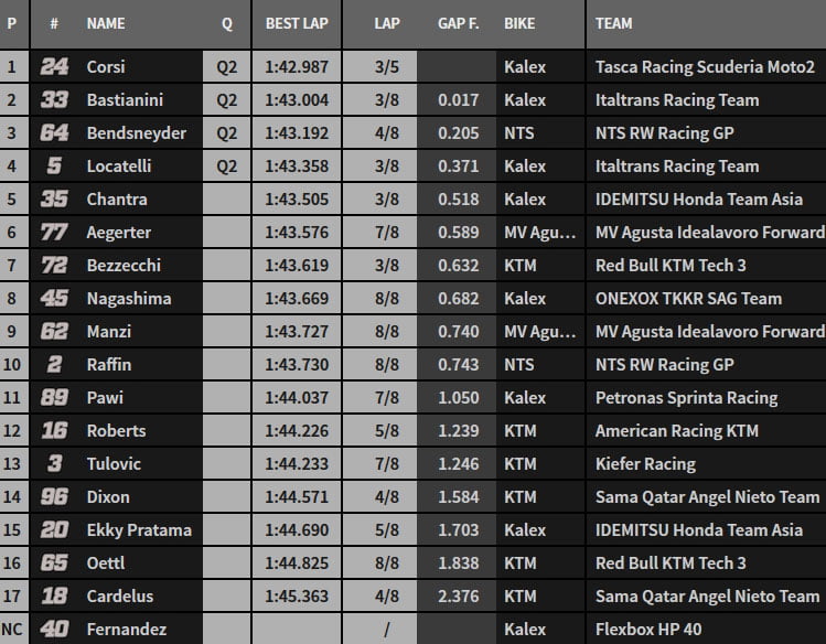 Comme en Moto3 et en MotoGP, il faut d’abord en passer par une Q1. Quatre en sortiront pour aller en Q2 aux airs de finale. En 1’43.004, Bastianini signe la première référence. Corsi fait mieux en passant la barre des 1’43. Bendsneyder avec sa NTS et Locatelli sont dans le bon carré lorsque les cinq dernières minutes pointent à l’horizon. Et on en restera là dans cette séance très vite figée. Bezzecchi partira 21ème et Öttl 30ème. On est encore loin du compte chez Tech3…